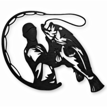 Silhouette d'un pêcheur attrapant du poisson, décoration murale en bois