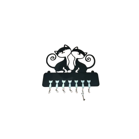 Porte-clés mural en bois "Couple de chatons" avec 7 petits porte-clés chat